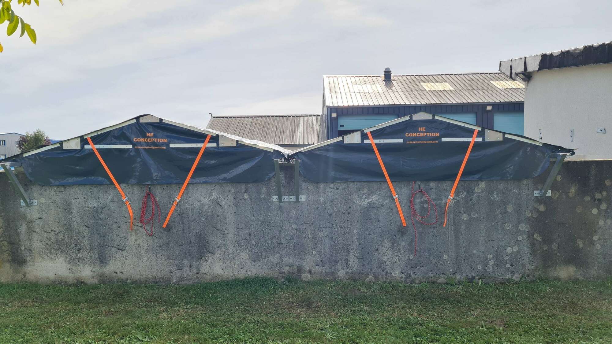Projets et essais en cours pour proposition de couverture rétractable avec triangulation d'arceaux en poutre bois + toile PVC + rails métalliques linéaires. Diversification des produits avec une entrée en gamme sur le marché des couvertures rétractables ou fixes.